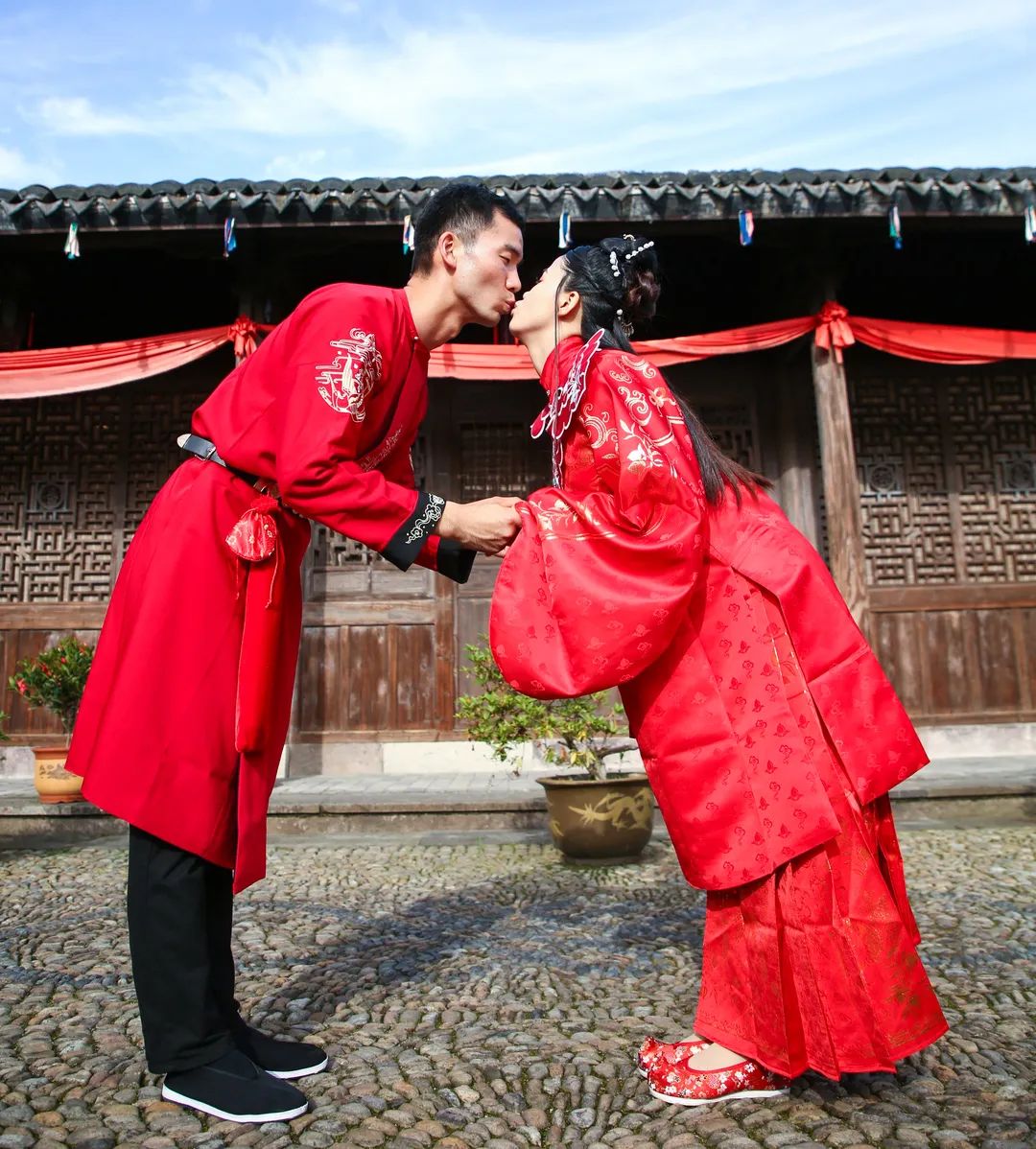 “一條紅絲綢,兩人牽繡球,月老定三生,攜手踏錦繡……”婚禮儀式在悠揚(yáng)的古琴聲中拉開序幕,新人們手牽紅繩款款而來,跨過火盆,踩過米袋,踏過瓦片,寓意幸福生活紅紅火火、代代相傳。共拜天地、感恩父母、纏發(fā)絲、飲合歡酒、拋繡球……古老的儀式里,新人們共同許下一生的承諾,觀禮人員也為他們送上了最誠摯的祝福。