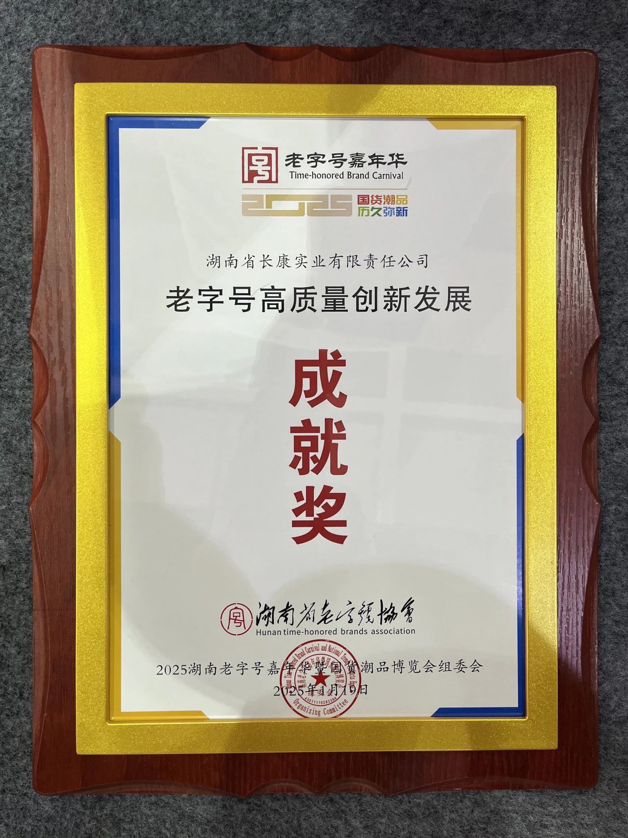 作為一家擁有深厚底蘊的老字號企業(yè),長康深知社會責任的重要性。在此次2025湖南老字號嘉年華暨國貨潮品博覽會上,長康更是喜獲老字號高質(zhì)量創(chuàng)新發(fā)展成就獎。
